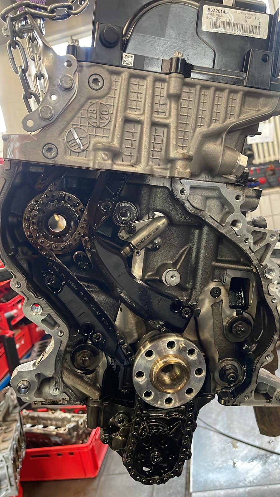Da der ursprüngliche Motor nicht mehr sinnvoll instand gesetzt werden konnte, wurde der BMW mit einem generalüberholten Austauschmotor auf Basis des passenden B47D20B versorgt. Das ist in solchen Fällen meist die sauberste Lösung, wenn Kolben, Brennraum und Zylinderkopf bereits schwer beschädigt sind.